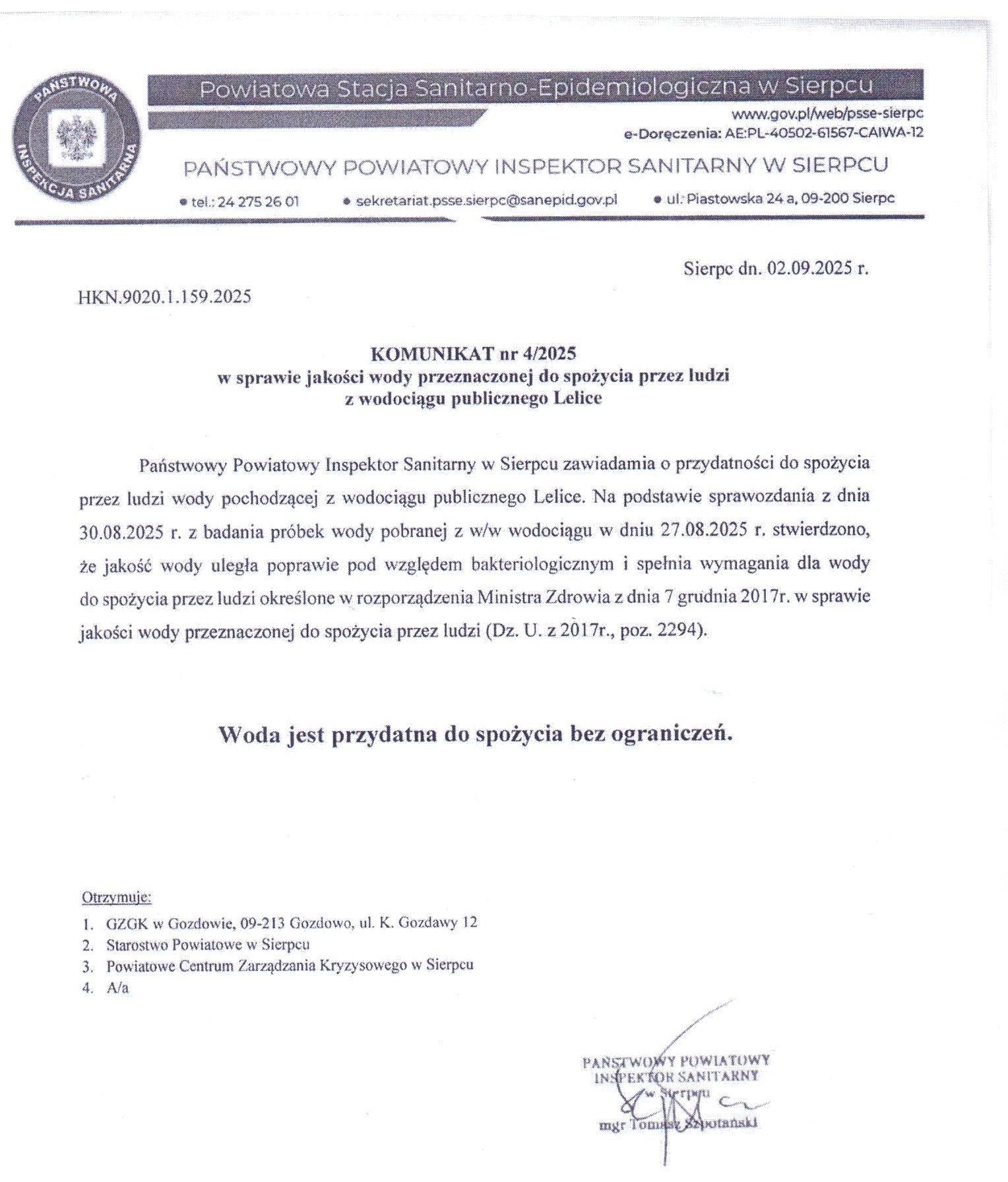 Komunikat w sprawie jakości wody przeznaczonej do spożycia przez ludzi z wodociągu publicznego Lelice.